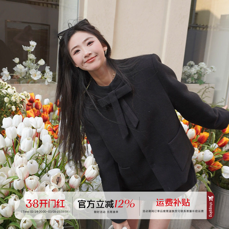 Amii格雷系毛呢套装女冬季2024新款减龄蝴蝶结呢外套半身裙两件套