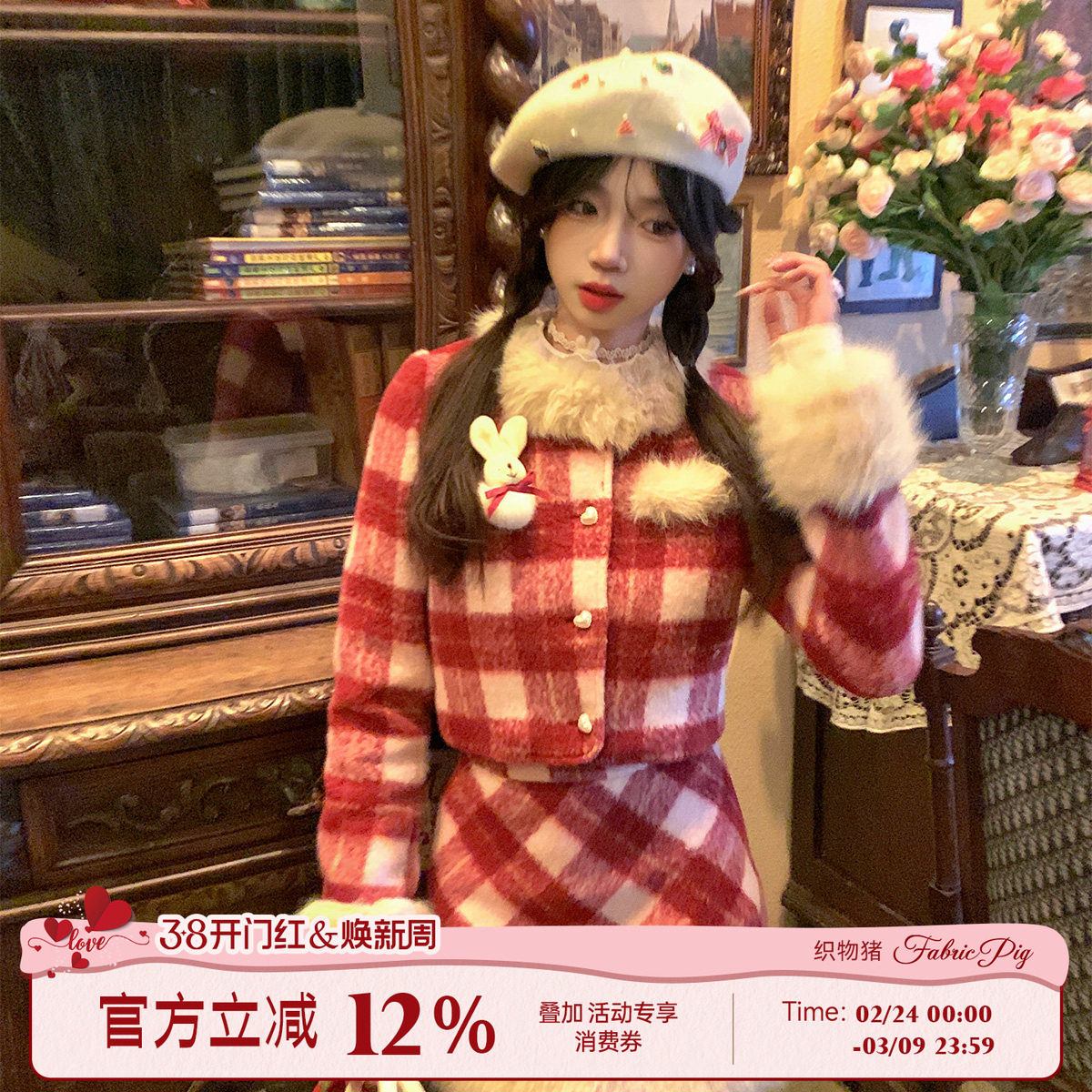 织物猪 新年晚宴 复古红色格纹毛呢套装女冬季夹棉加厚半裙两件套