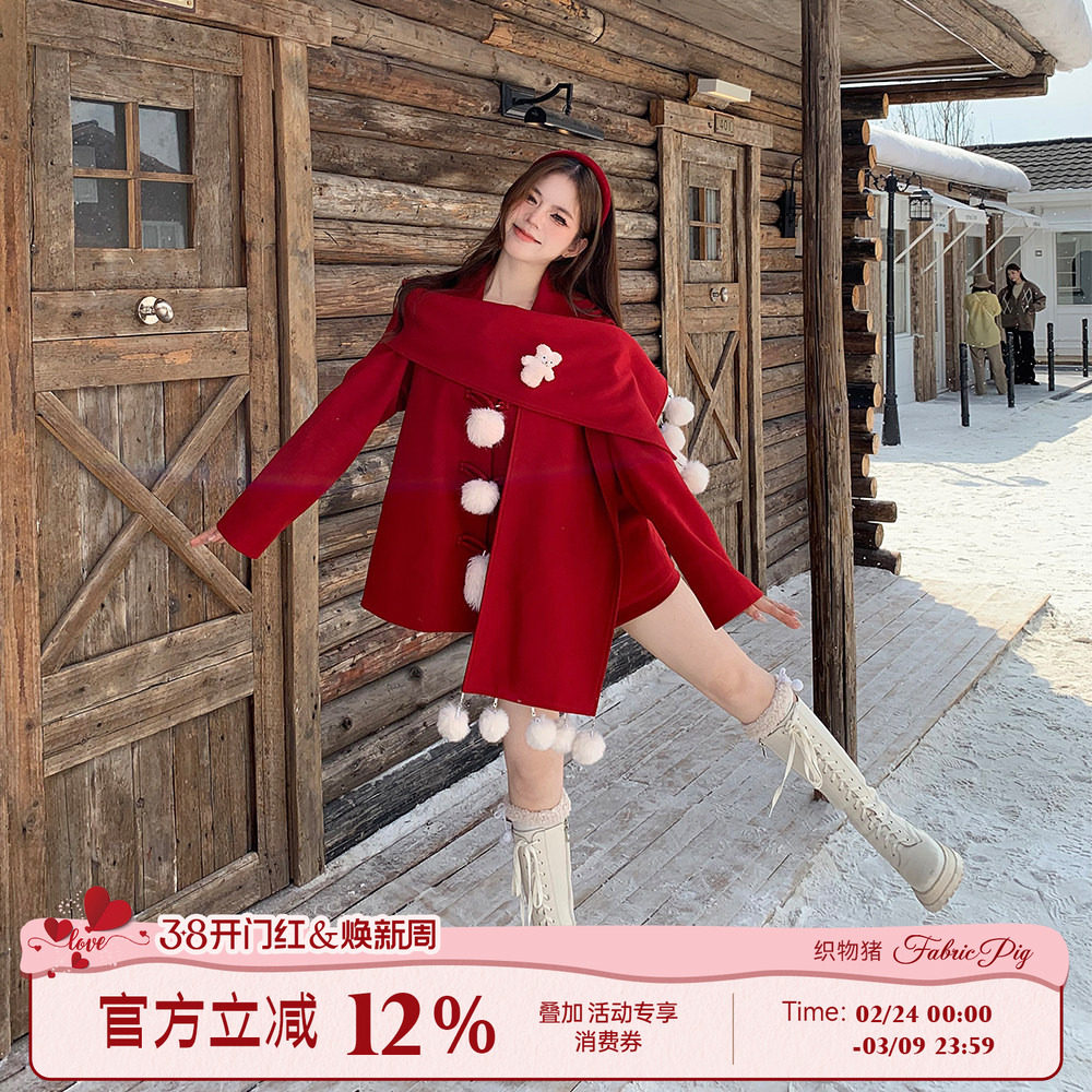 织物猪 球球芝士 新年红色斗篷毛呢套装女冬季加厚保暖外套两件套
