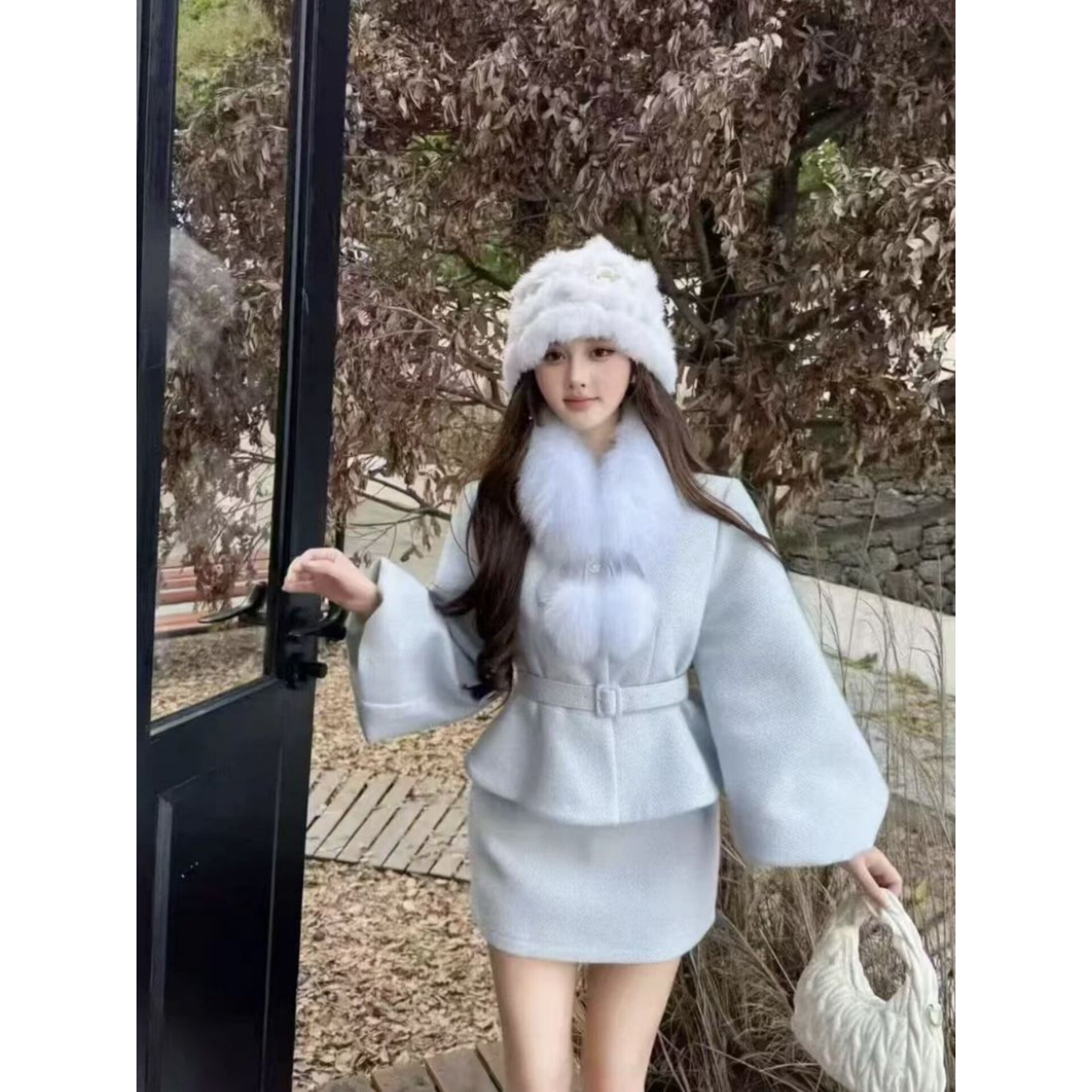 千金风蓝色毛呢套装女冬装毛领外套半身裙两件套腰带高级感套装裙