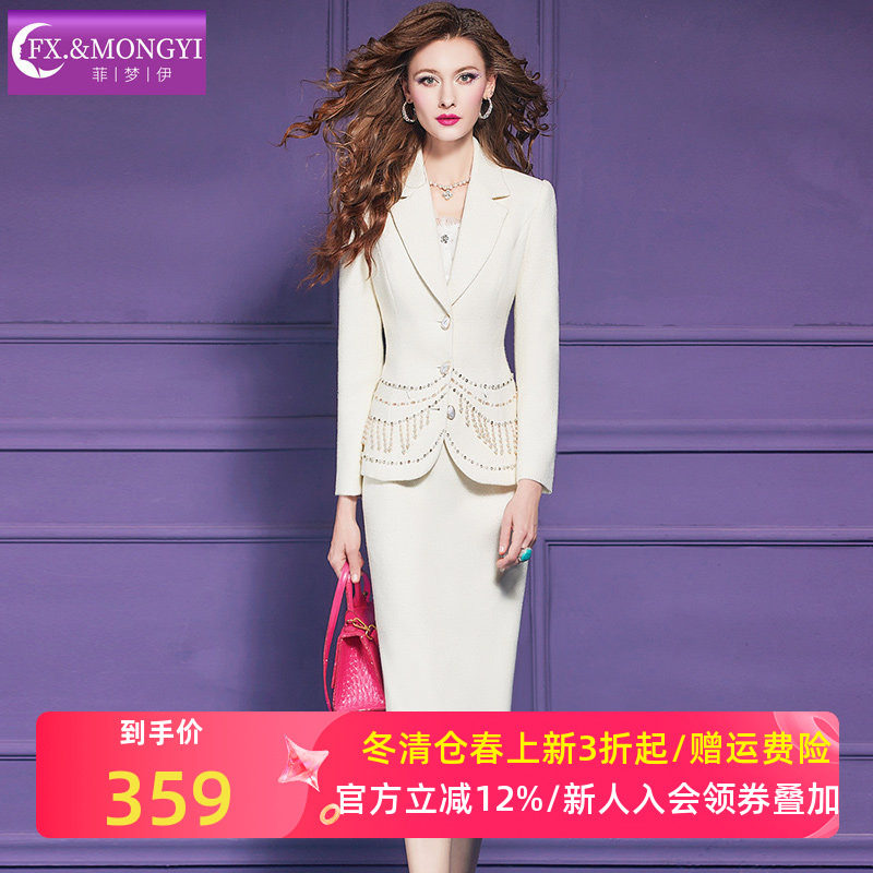 菲梦伊含羊毛钉珠白色毛呢套装女冬季商务正装西装外套职业半身裙