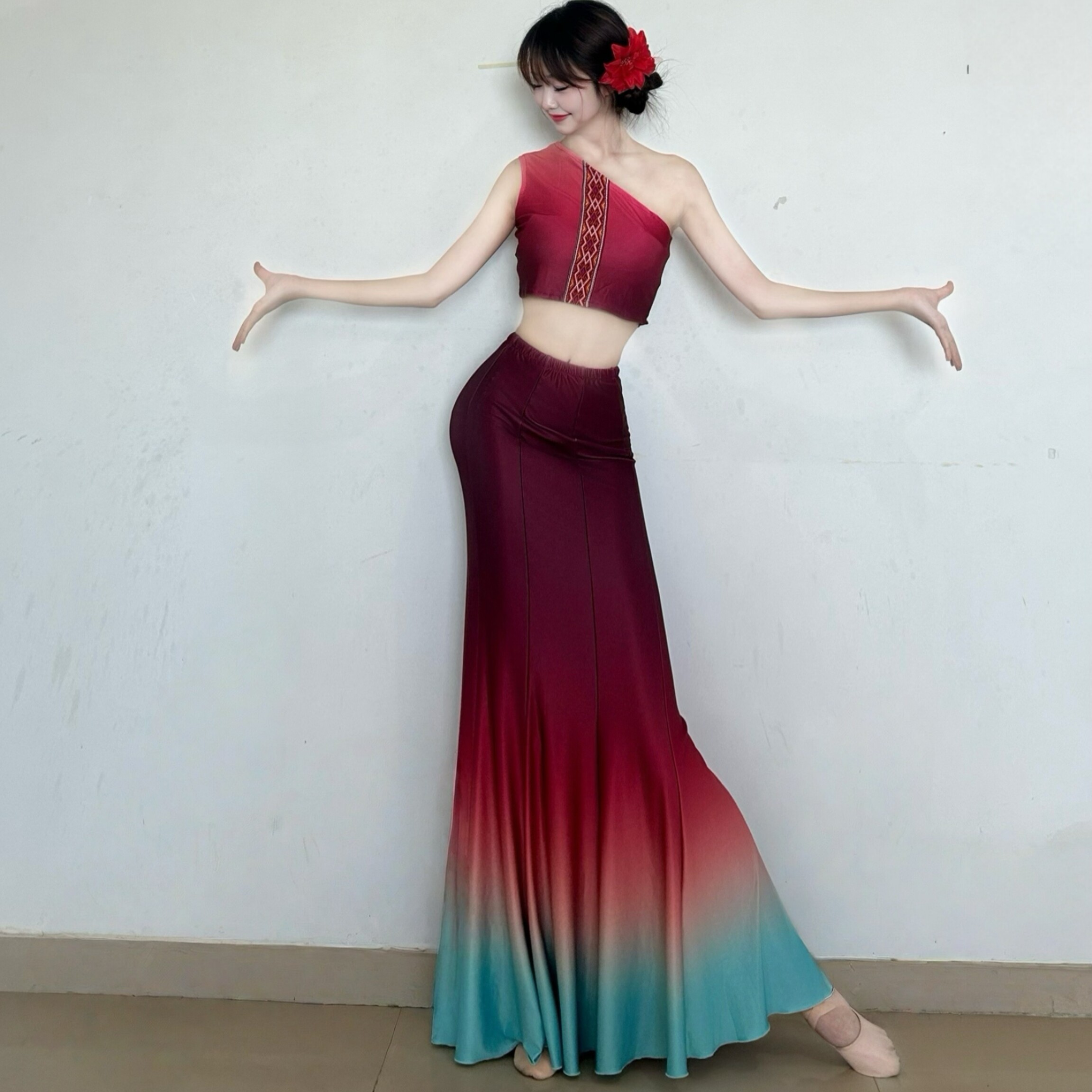 成人傣族舞蹈演出服单肩包臀艺考伞舞服装孔雀舞练功服渐变色定制