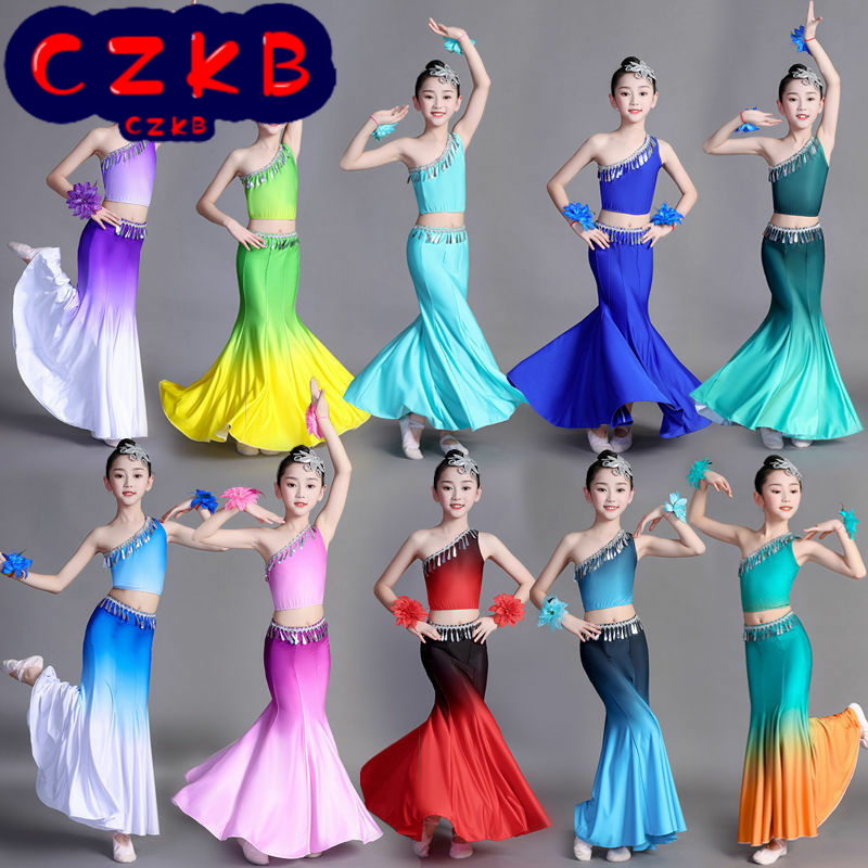 儿童傣族舞蹈演出服装女半身渐变裙六一孔雀舞台服饰鱼尾裙练习裙