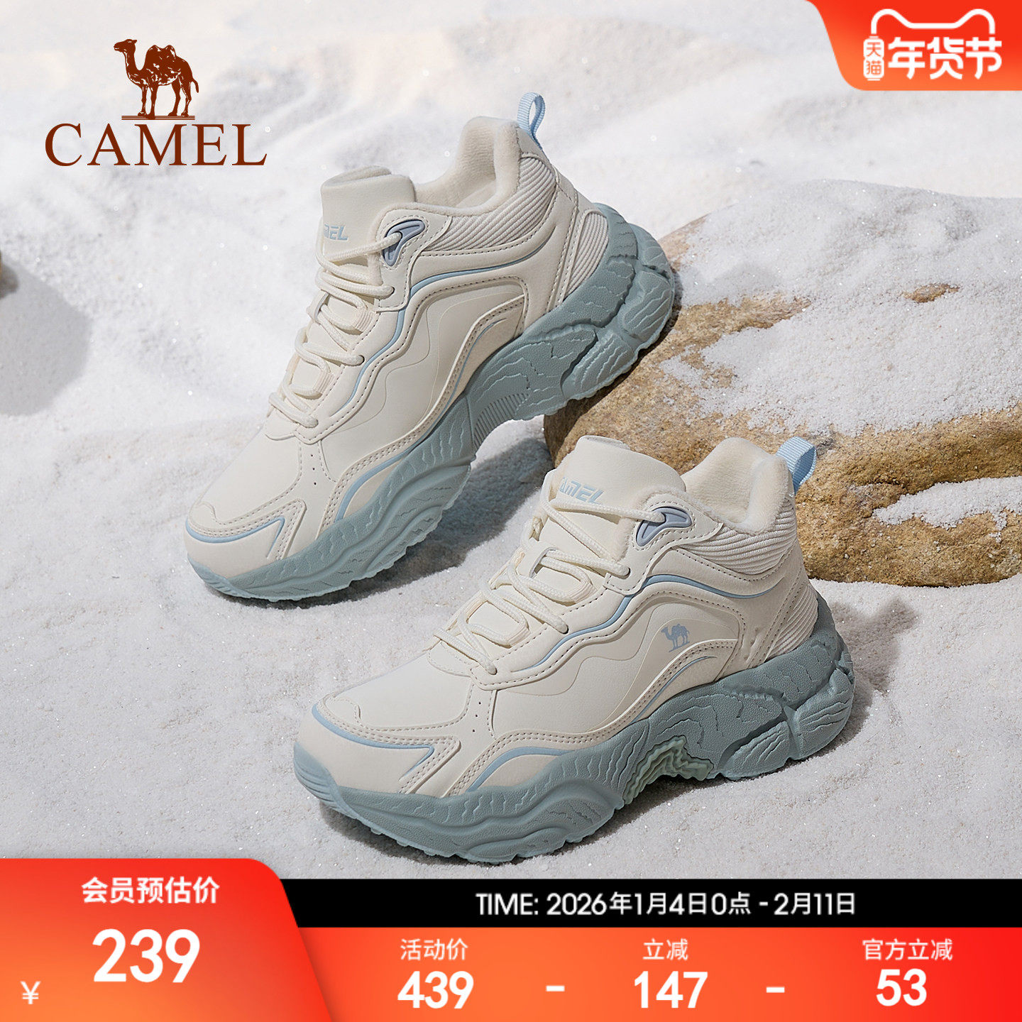 骆驼热雪2.0运动鞋冬季户外雪地靴高帮女鞋防滑防水加绒保暖棉鞋