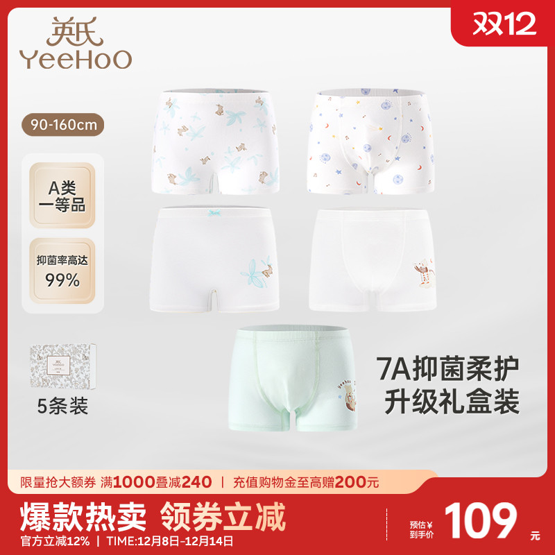 英氏儿童内裤礼盒装透气7A抑菌宝宝平角裤男女童打底短裤不夹屁屁