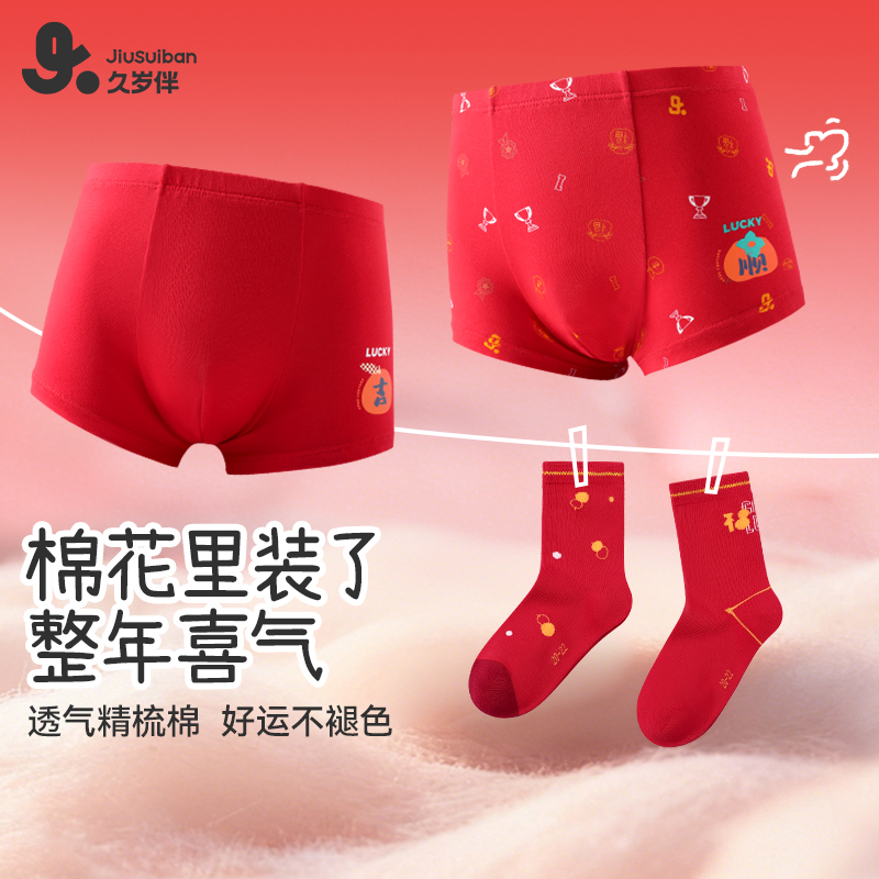 久岁伴儿童内裤男童秋冬平角短裤中大童宝宝红运透气蚕丝裆礼盒装