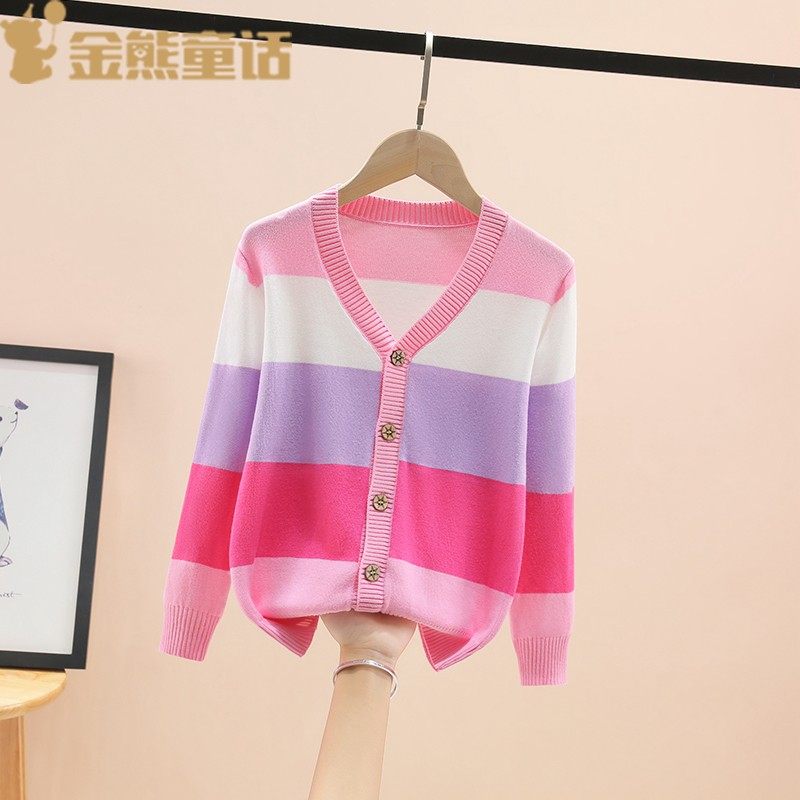 女童开衫毛衣2023新款薄外套秋款纯棉针织打底衫条纹上衣儿童装