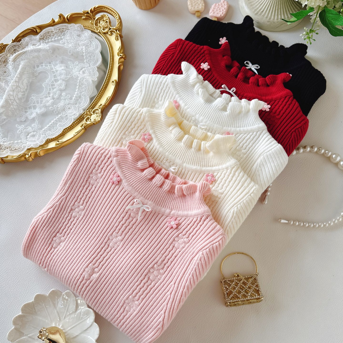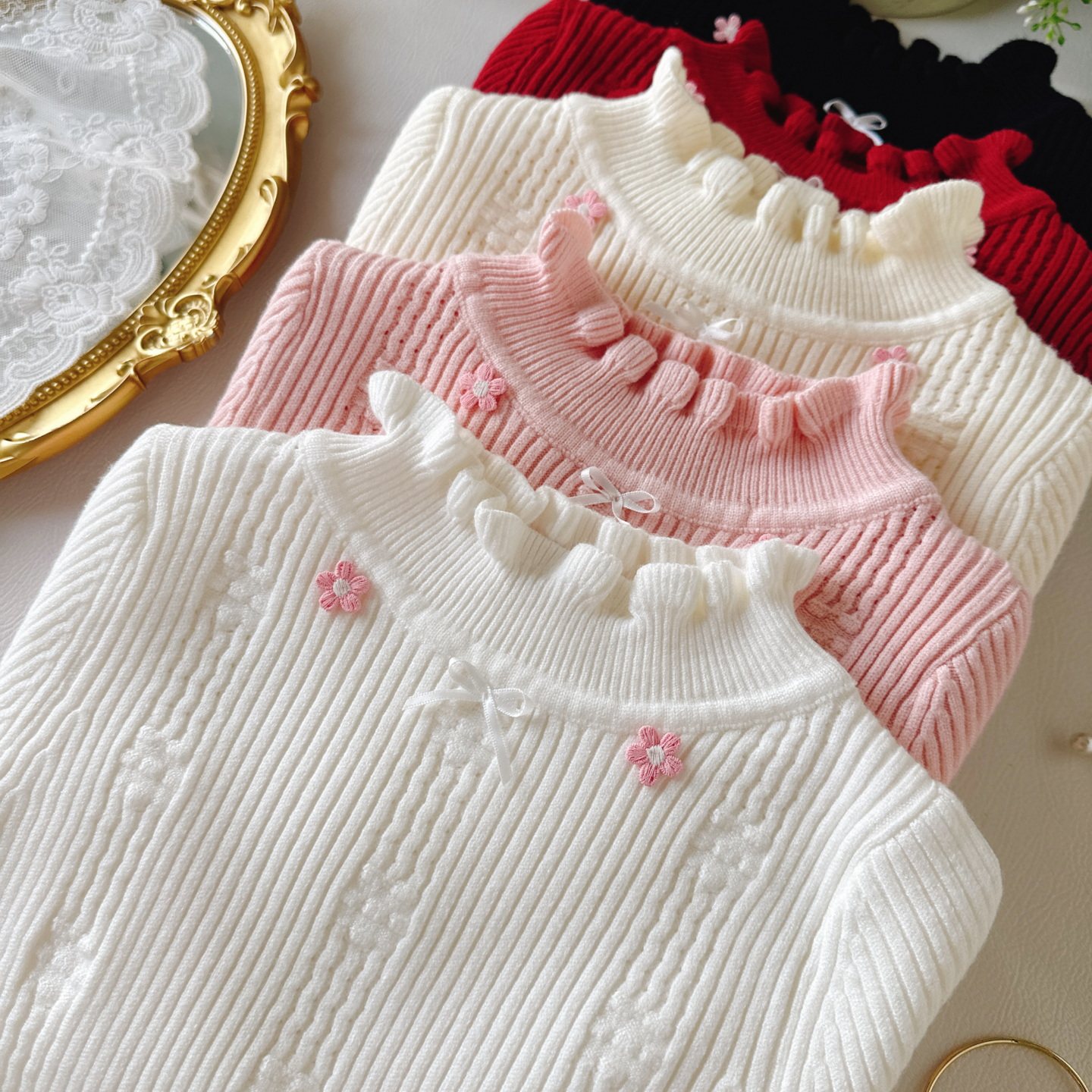 女童打底毛衣2025新款女孩毛线衣薄款花边领春秋款内搭打底衫花朵