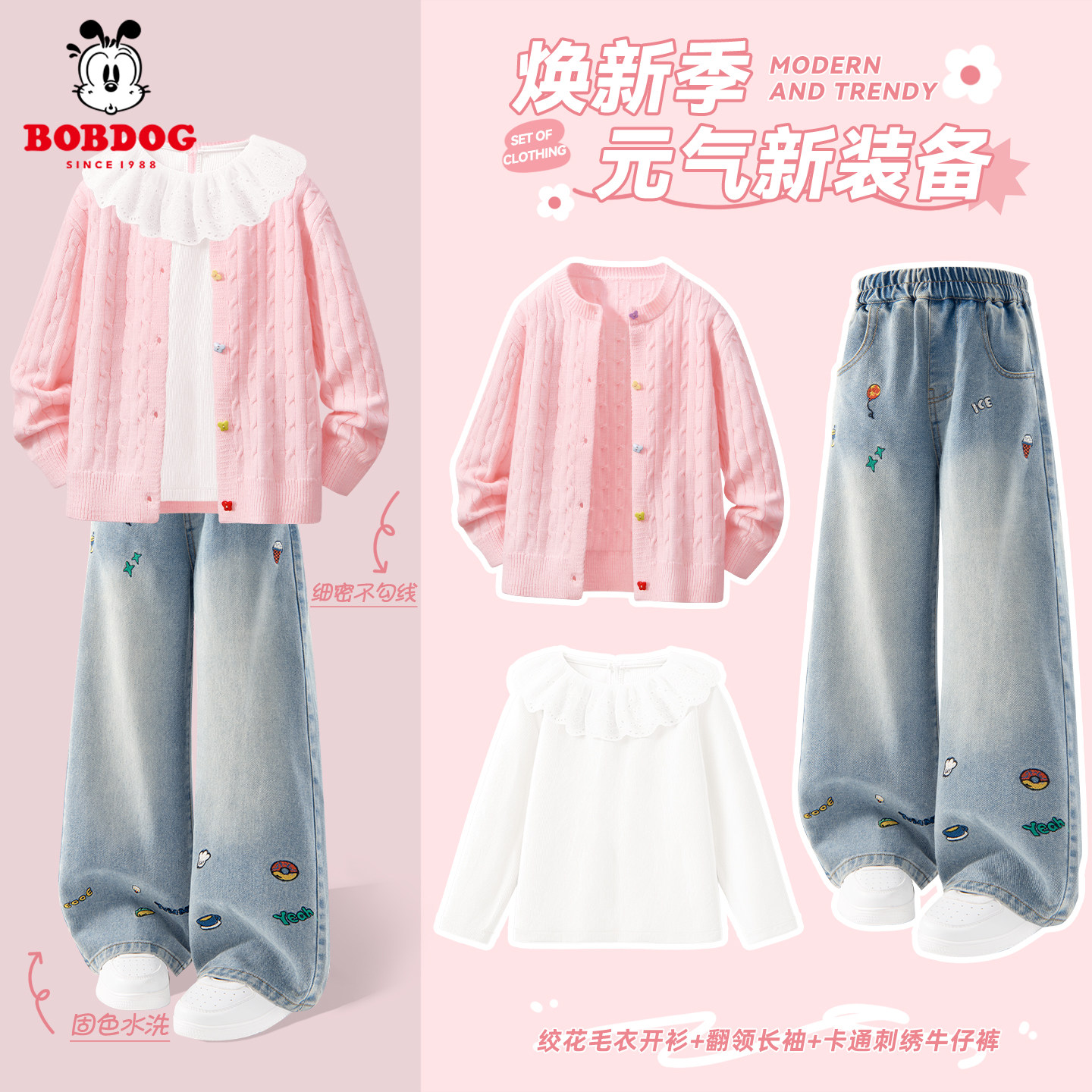 巴布豆儿童春秋款套装2026新款薄款女童毛衣打底衫三件套洋气时髦