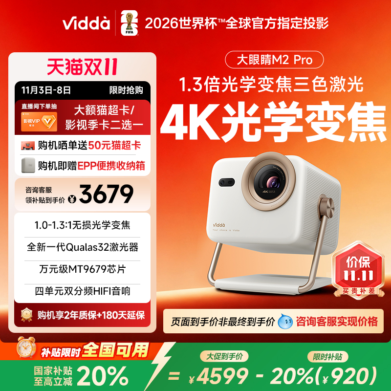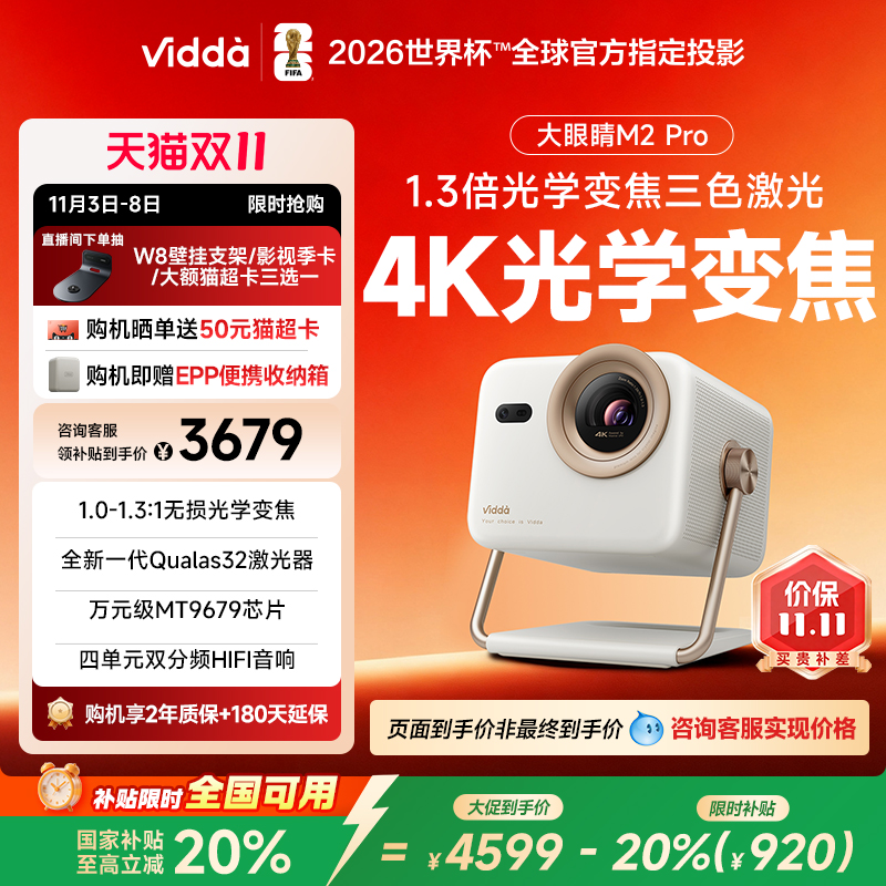 【政府补贴立减20%】Vidda大眼睛 M2 Pro海信光学变焦4K超高清三色激光投影仪家用卧室游戏电视手机家庭影院