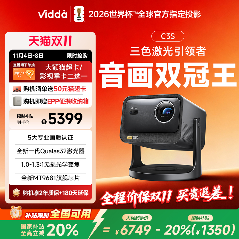 【政府补贴20%全国可用】Vidda C3S 海信MT9681光学变焦JBL家用三色激光投影仪4K超高清游戏电视手机家庭影院
