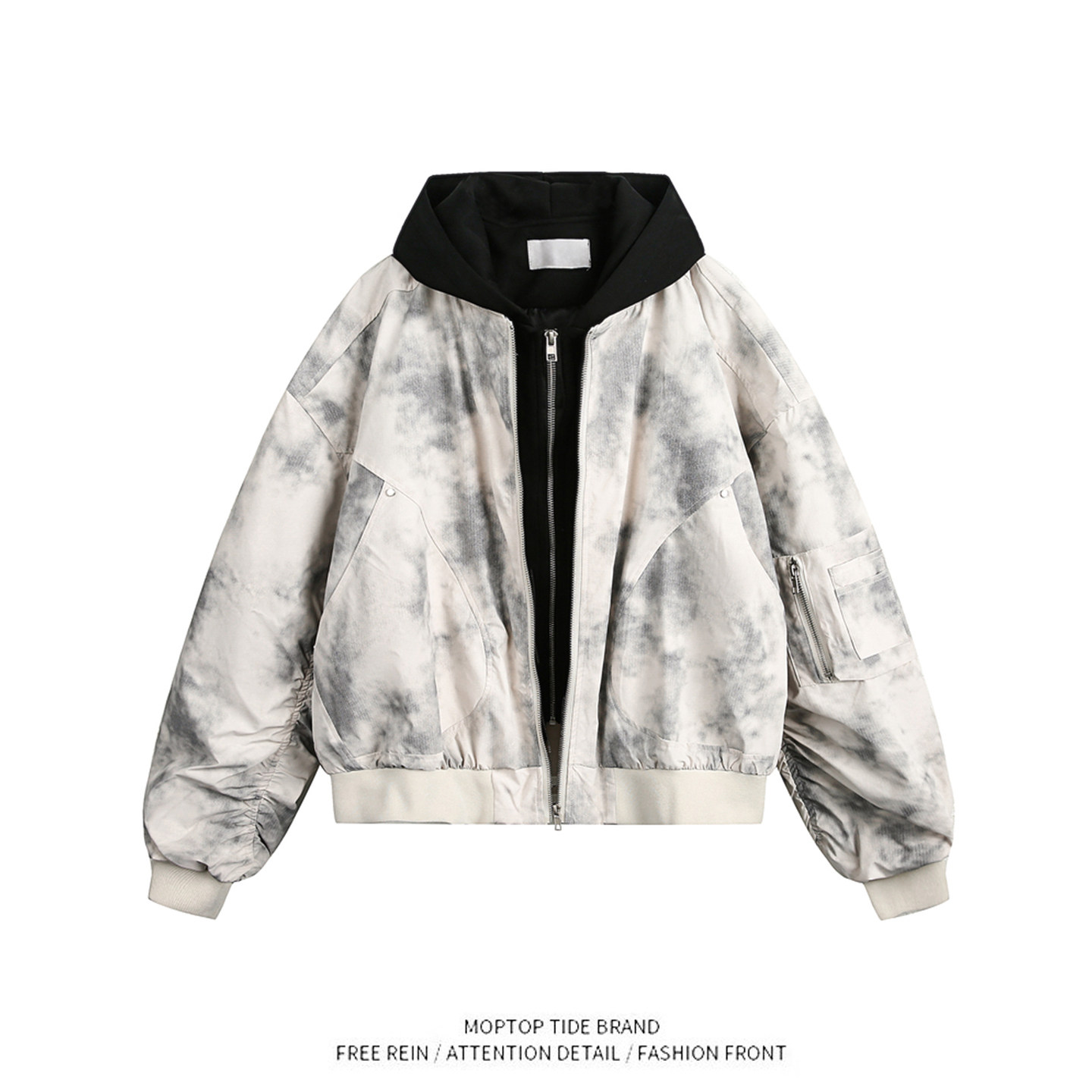 WHXS美式扎染假两件飞行员夹克女男款春季潮牌复古连帽棒球服外套