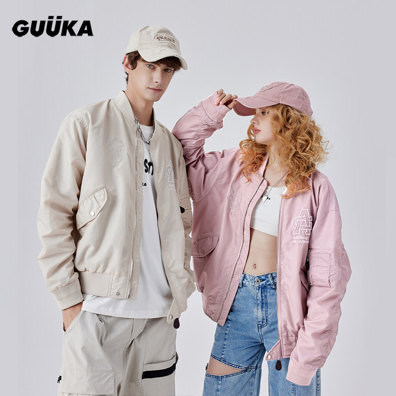 GUUKA潮牌新款抽褶袖子外套女春秋 美式联名粉色短款飞行员夹克女