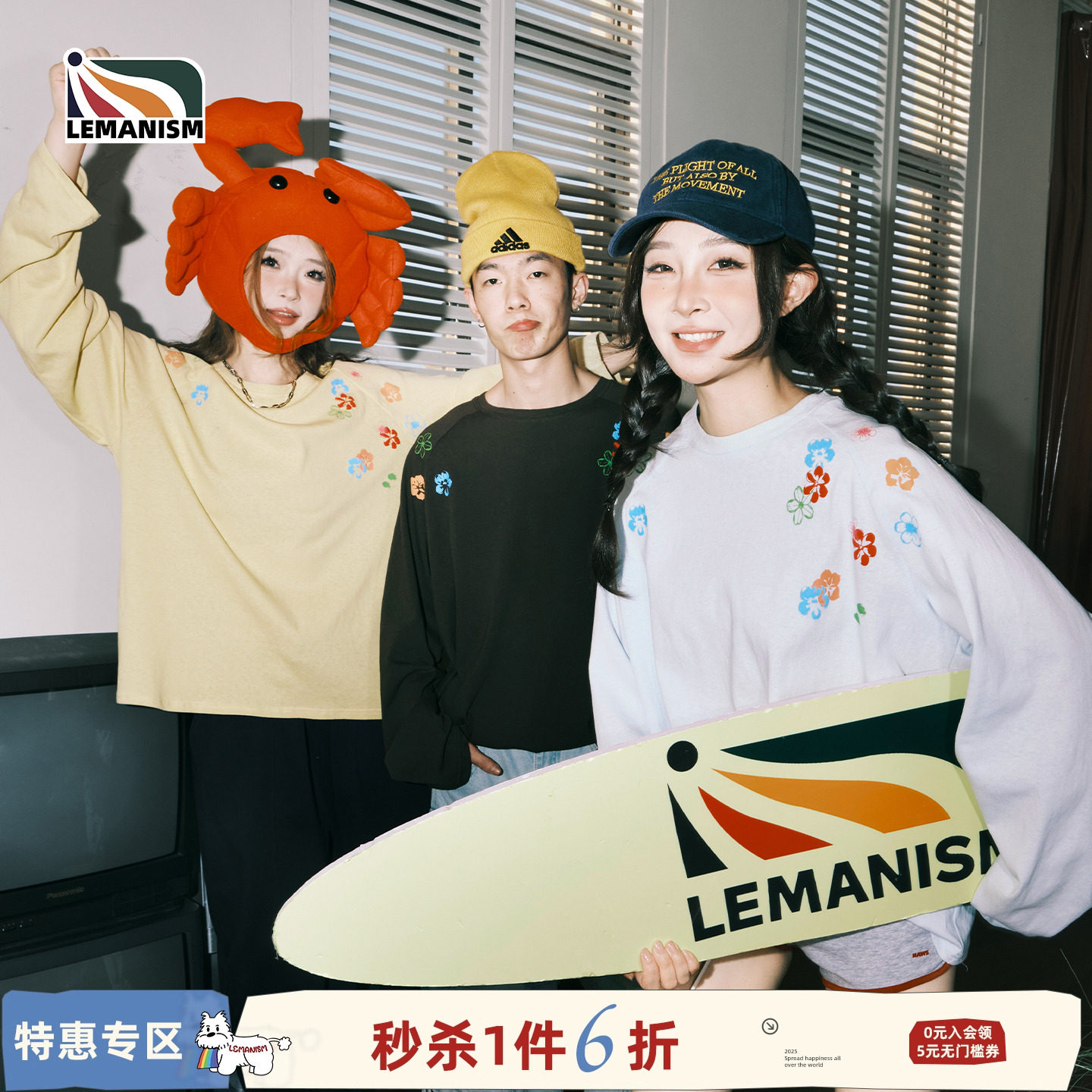 lemanism美式花朵印花长袖T恤男情侣款圆领上衣潮牌宽松体恤衫女