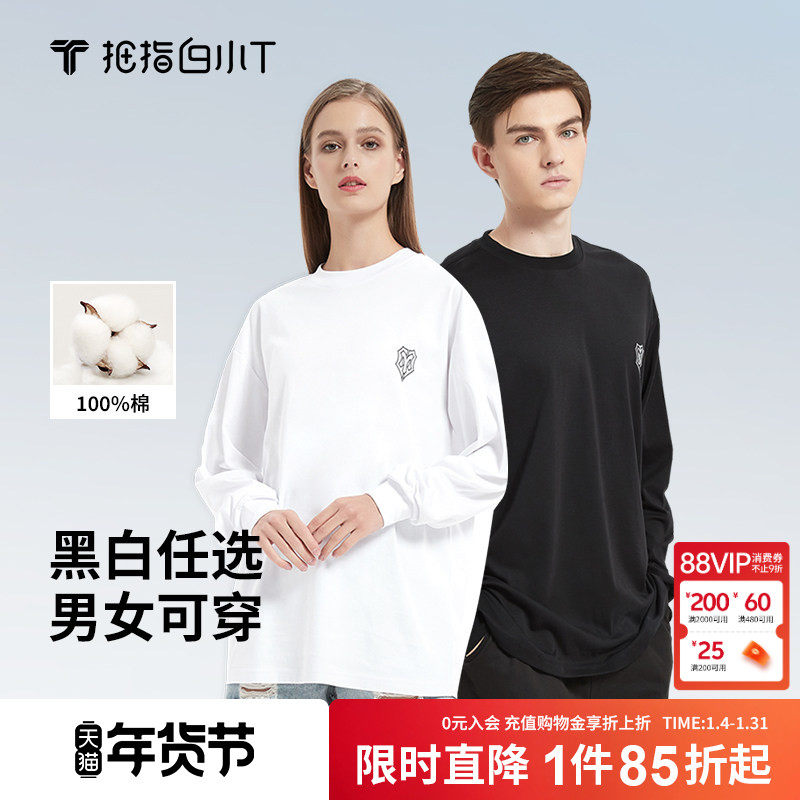 拇指白小T长袖T恤男女宽松纯棉秋季廓形体恤情侣装男女同款纯色