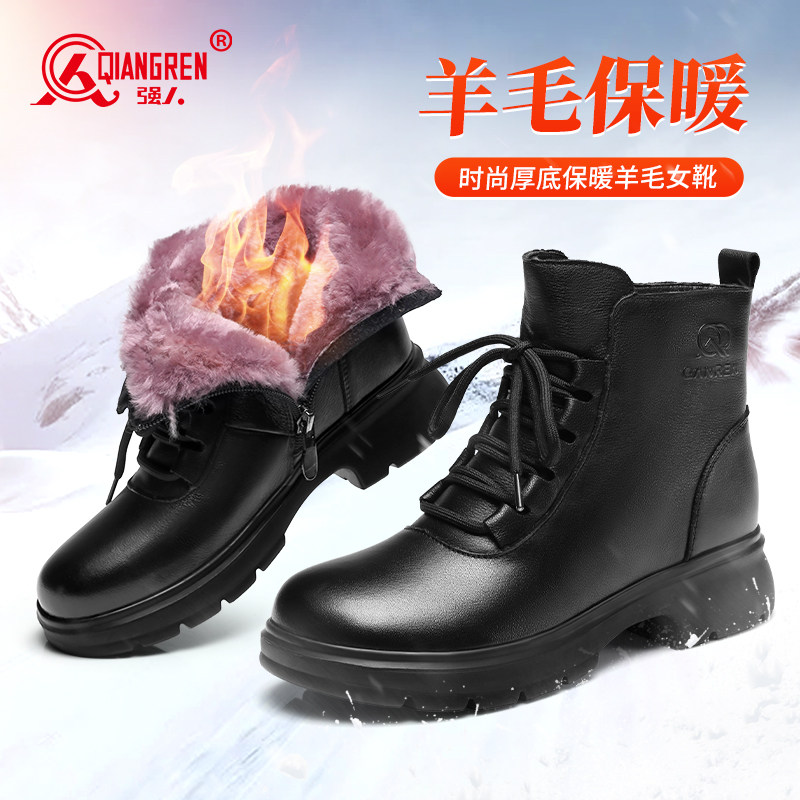 强人3515女鞋冬季保暖女士棉鞋真皮中跟加厚羊毛靴加绒棉靴短靴子