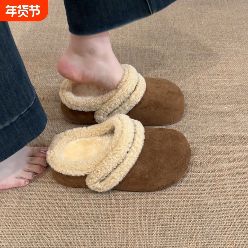 加绒勃肯鞋包头半拖2025新款冬季加厚保暖女士毛茸茸雪地靴子棉鞋