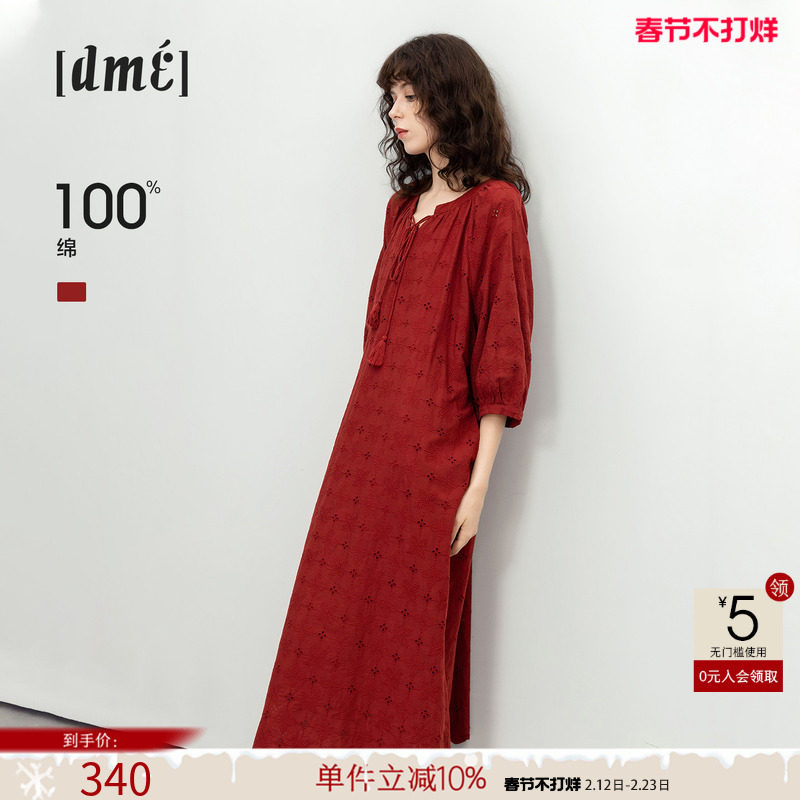 德玛纳法式文艺风纯棉连衣裙女26春秋新款蕾丝刺绣系绳荷叶边长裙