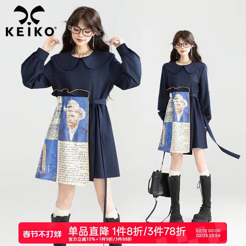 KEIKO文艺感拼接印花娃娃领连衣裙26春季出游田园风系带显瘦A字裙