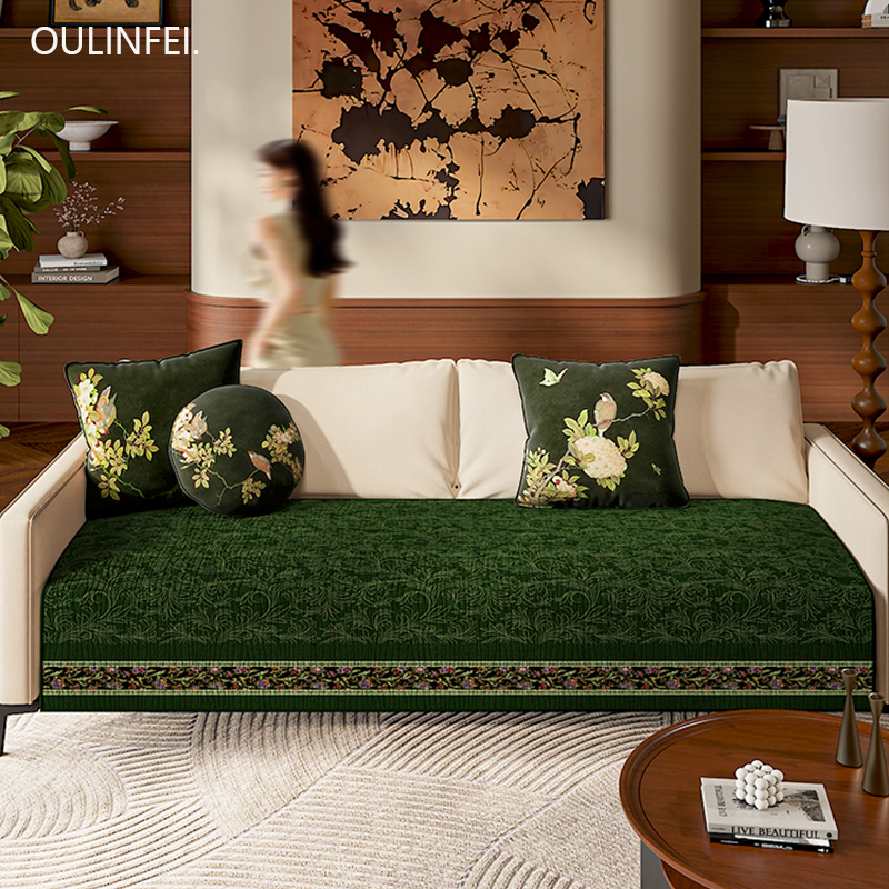 复古美式绿色沙发垫子四季通用2025新款高级感真皮防滑坐垫盖布巾