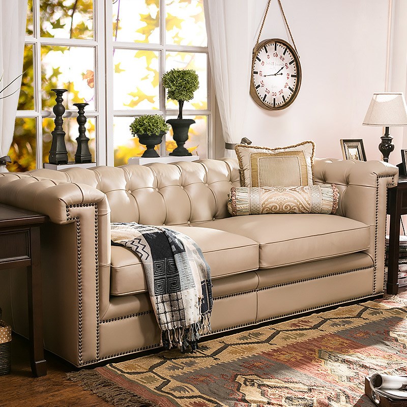 复古轻奢美式真皮拉扣沙发客厅2024新款中古风直排三人位设计师款