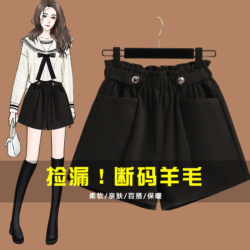 唯哥弟风松紧腰羊毛呢子短裤秋冬新款A字花苞阔腿裤大码显瘦靴裤