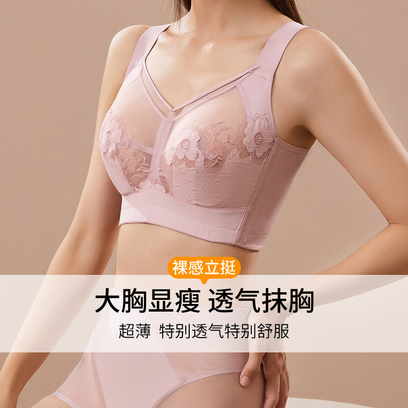 纯欲性感蕾丝超薄大码内衣无钢圈大胸显小文胸聚拢上托调整型胸罩