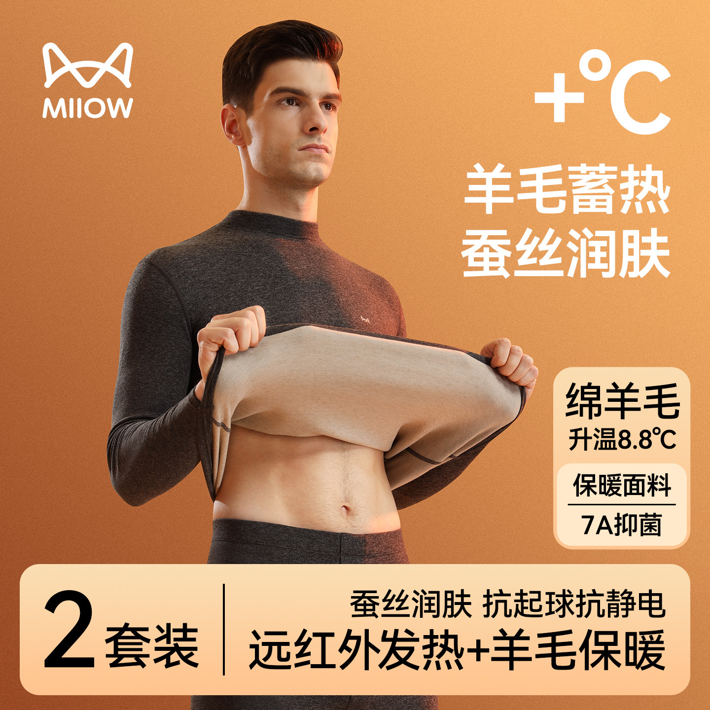 猫人男士保暖内衣套装男款加厚羊毛蚕丝发热半高领打底秋衣秋裤冬
