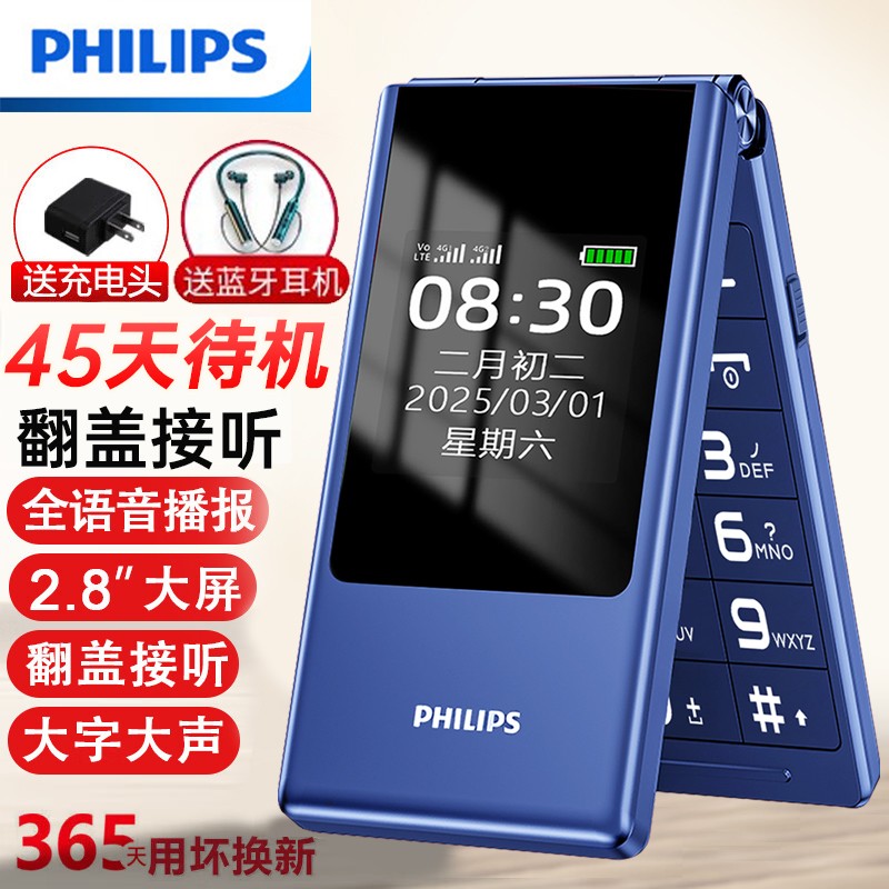 [官方旗舰店]飞利浦翻盖老年机翻盖接听4G全网通超长待机语音播报老人手机一键拨号大字大声按键老人机