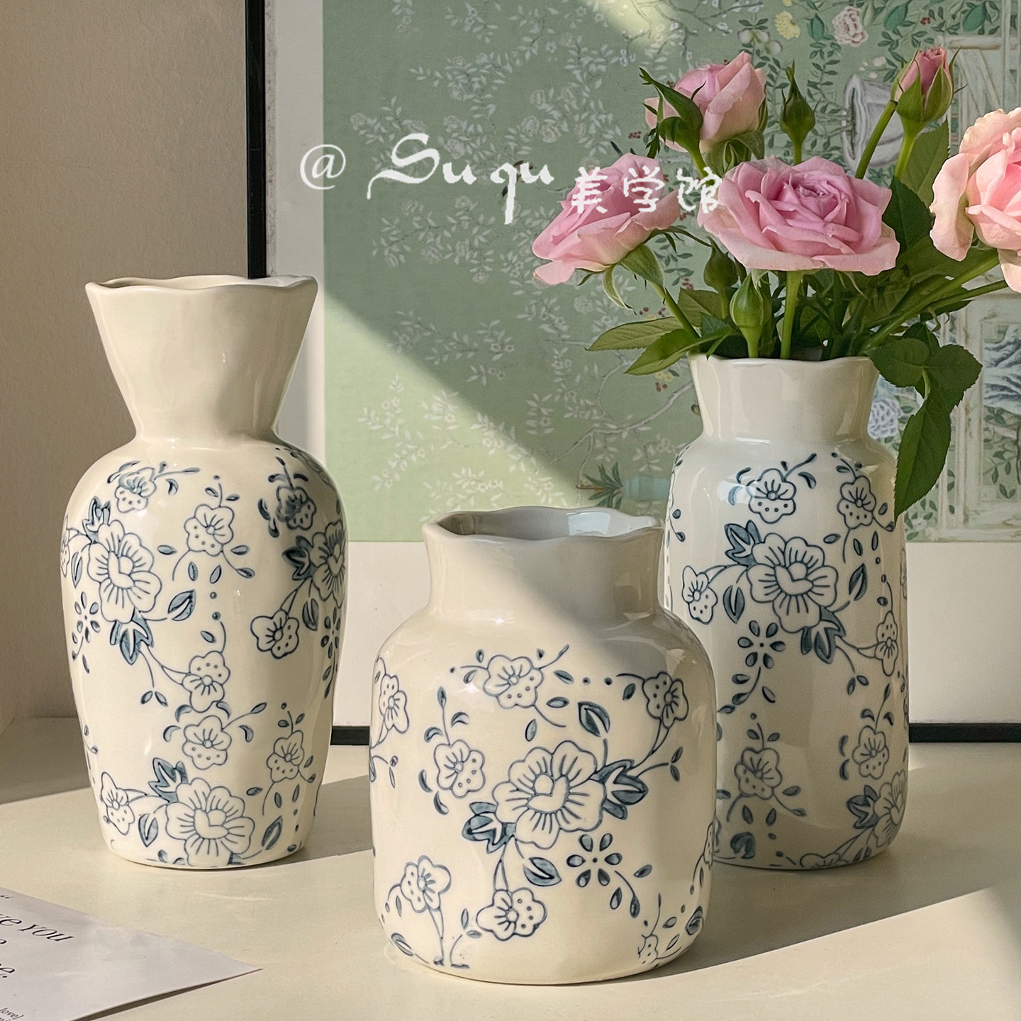 简约小青花瓷花瓶陶瓷鲜花绿植插花客厅书房茶桌装饰品摆件新中式