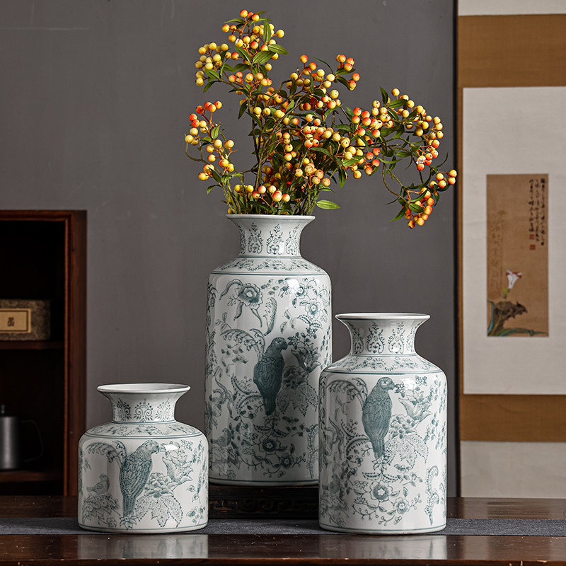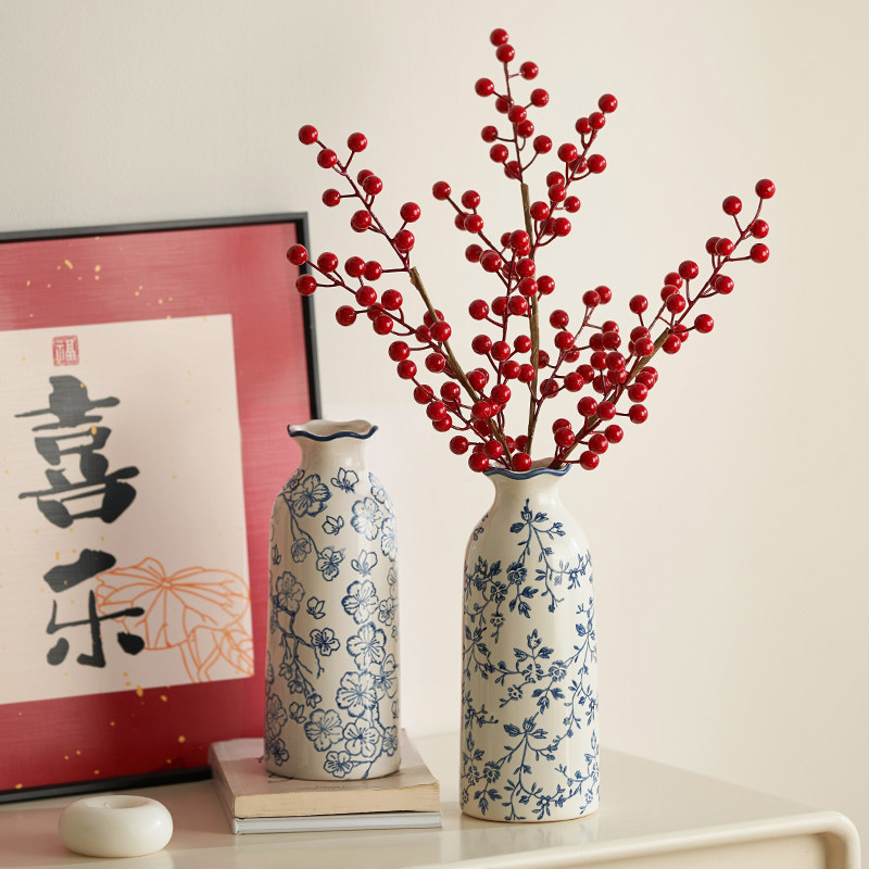 新中式青花瓷花瓶陶瓷客厅装饰品摆件冬青红果发财果插干花器复古
