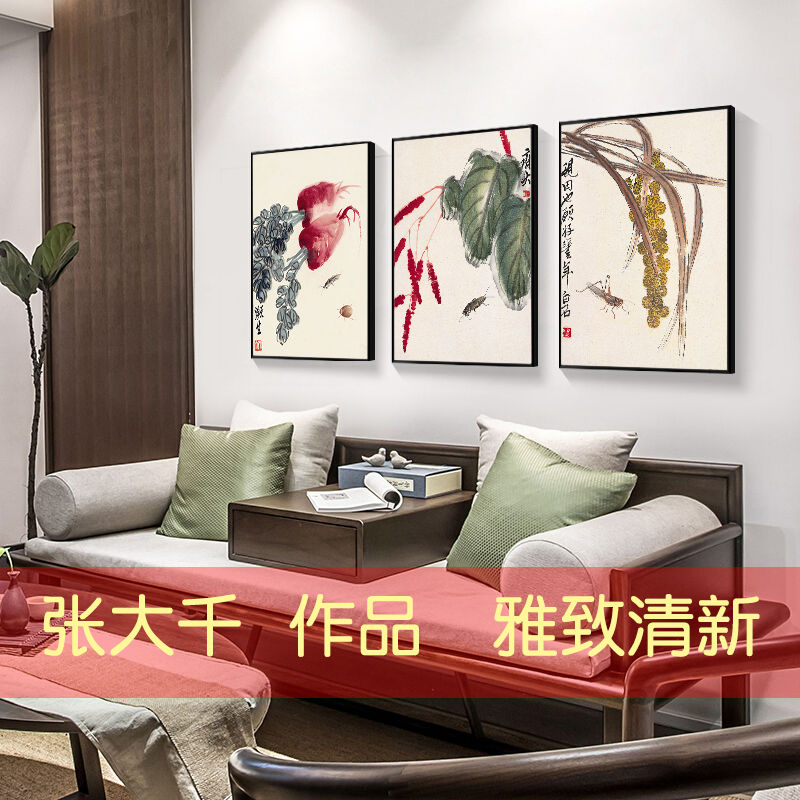 新中式装饰画客厅三联画沙发背景墙禅意壁画挂画名人画张大千兰花