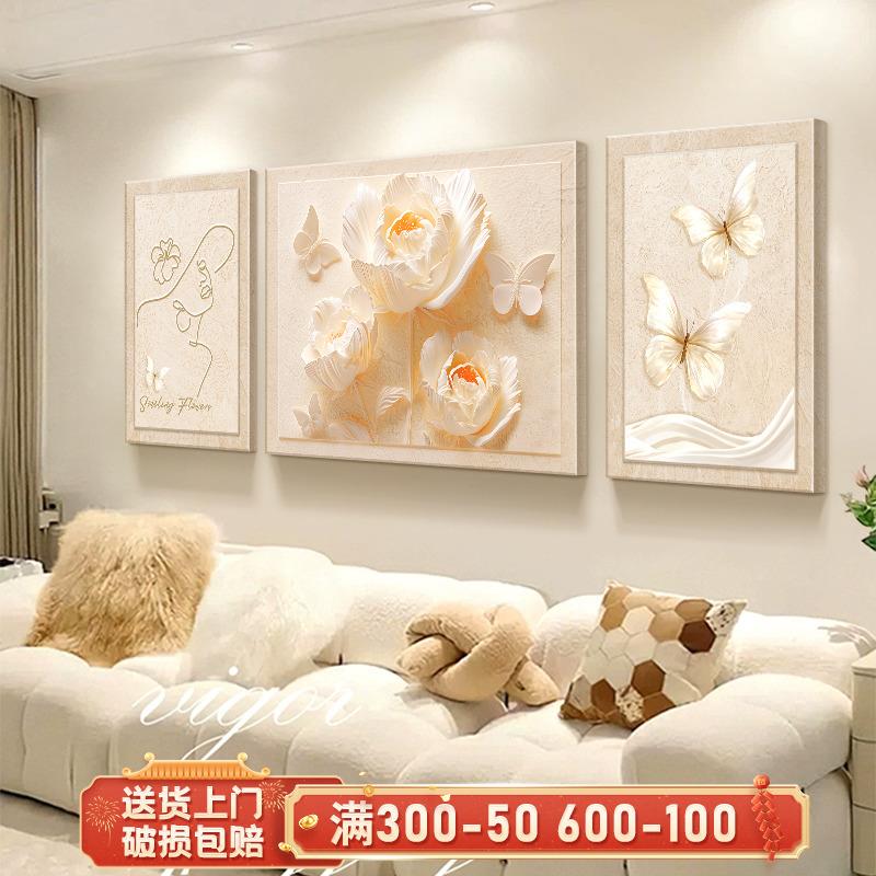 奶油风富贵牡丹装饰画高级立体感花卉客厅三联画沙发背景墙壁挂画