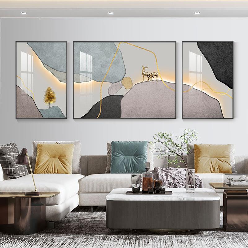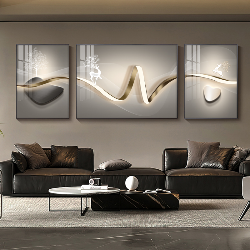轻奢客厅装饰画晶瓷三联画沙发背景墙面挂画麋鹿简约现代新款壁画