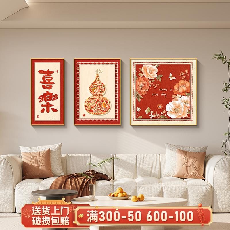 葫芦客厅大白墙装饰画新中式平安喜乐三联画沙发背景墙中国风挂画
