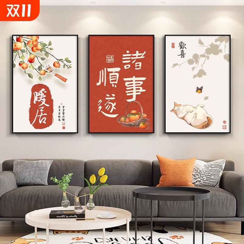 诸事顺遂客厅装饰画新中式寓意好三联画沙发背景墙挂画新中式壁画