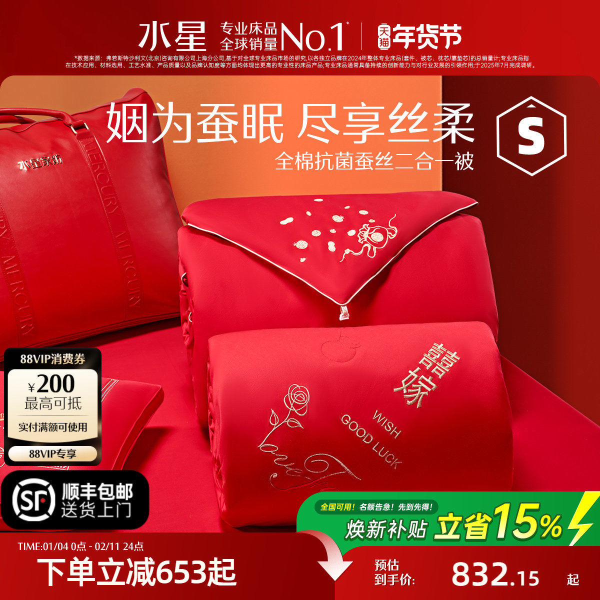 水星家纺被芯抗菌蚕丝二合一被婚庆蚕丝被大红全棉子母被新年送礼