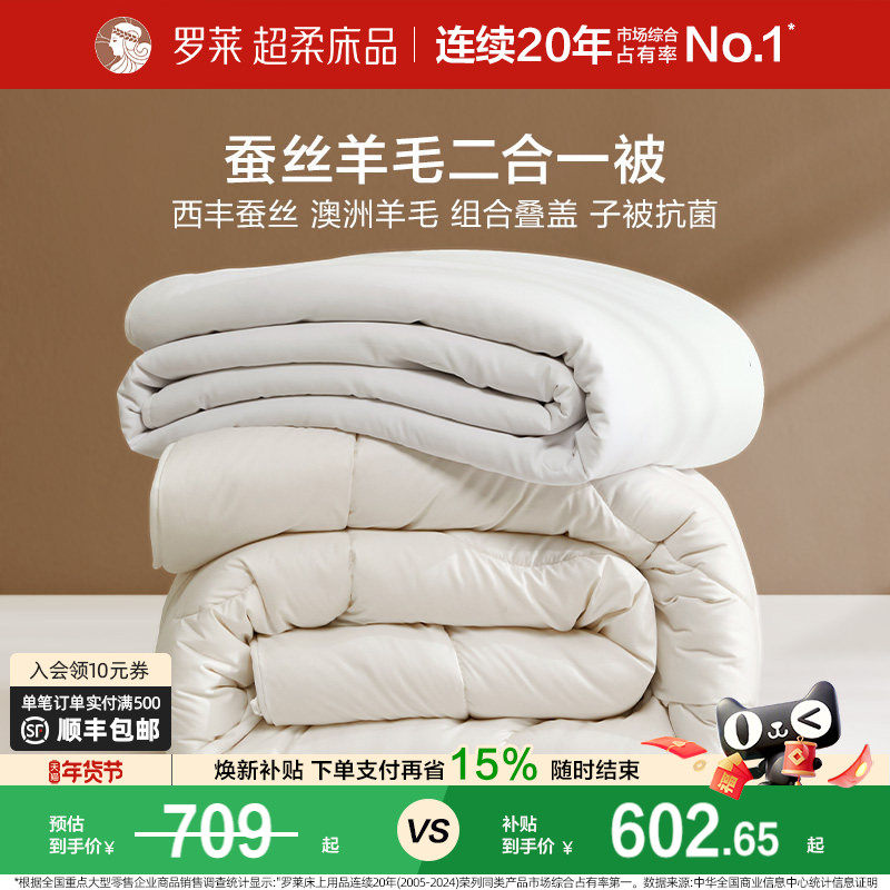 罗莱家纺被子蚕丝澳洲进口羊毛二合一子母被抗菌防螨被芯四季可用