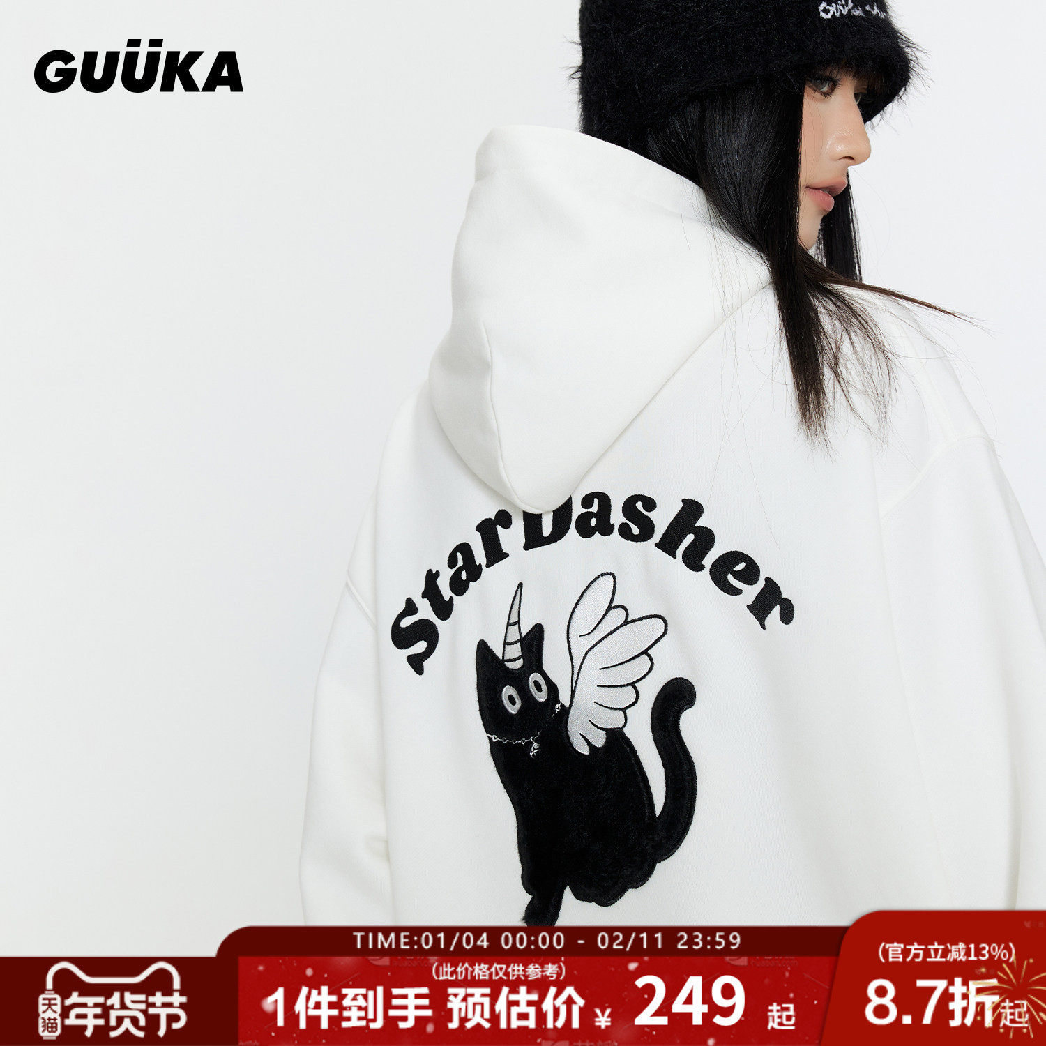 GUUKA潮牌白色独角猫咪卫衣女款春秋新款 加绒加厚落肩连帽衫宽松