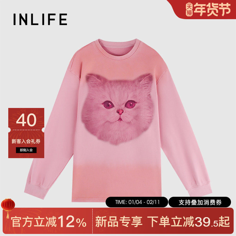 伊纳芙宽松圆领印花猫咪卫衣女春季新款时尚高级扎染休闲长袖T恤