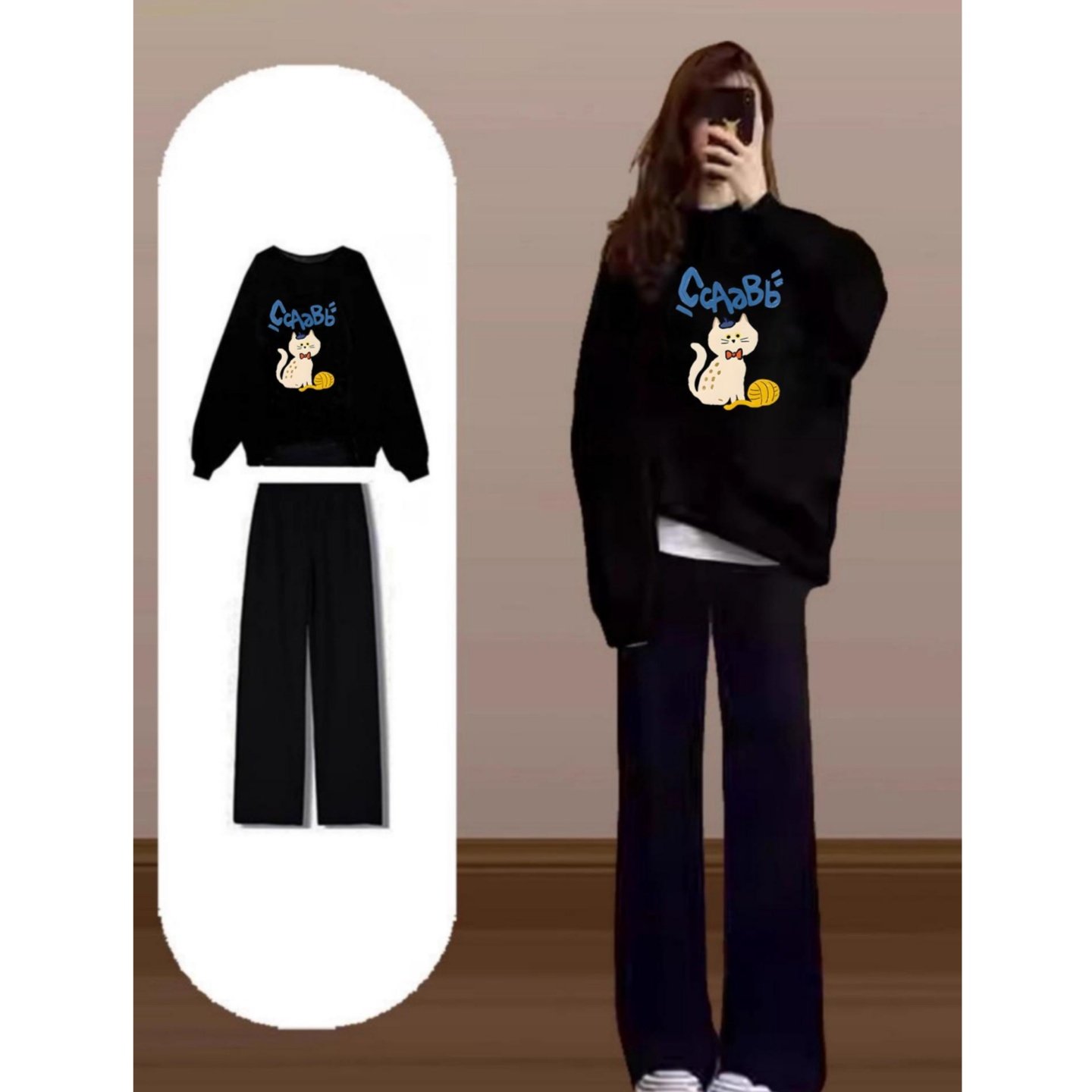 韩版卡通猫咪卫衣女圆领黑色宽松大码中长款保暖冬季加绒加厚上衣