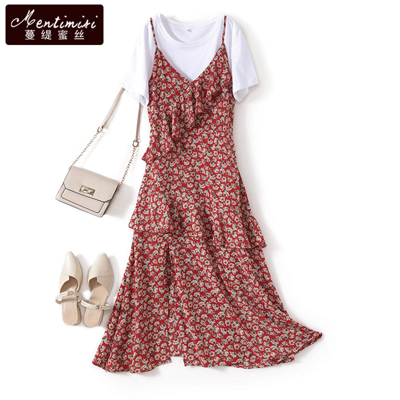 吊带碎花雪纺连衣裙女夏大码女装胖妹妹mm气质两件套油画中长裙子