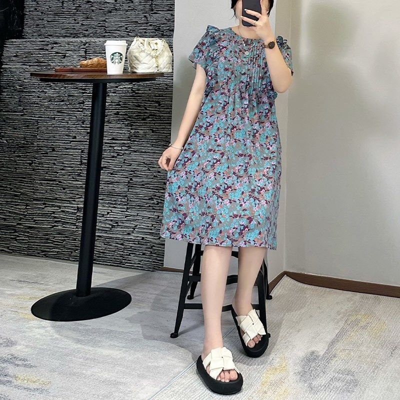 2025夏季新款女装宽松荷叶摆大码胖妹妹雪纺碎花显瘦连衣裙女