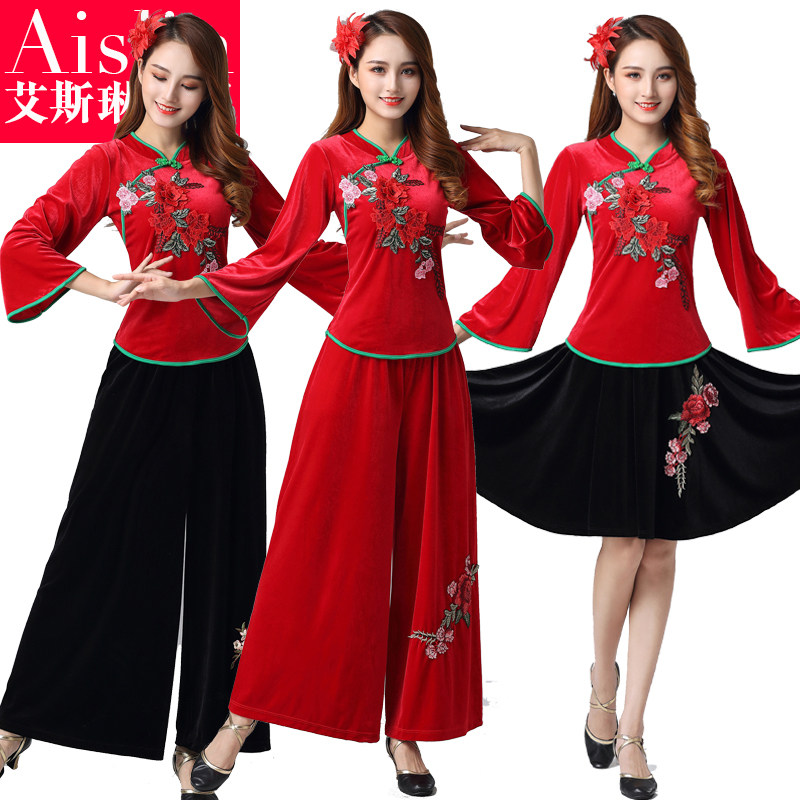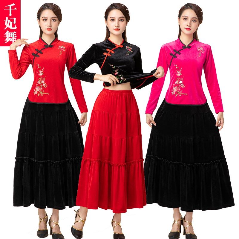 广场舞服装套装秋冬装新款牛奶丝加绒加厚民族风扇子舞舞蹈演出服