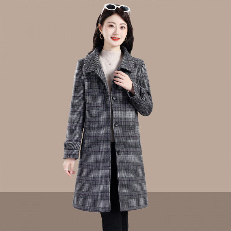中长款中年妈妈装修身洋气春秋装西装领风衣大码女装格子毛呢外套