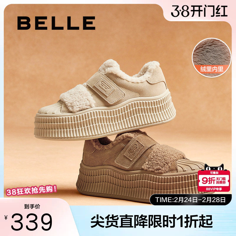 百丽贝壳头毛毛加绒厚底板鞋女春季新款休闲雪地靴棉鞋子D3L1DAM5