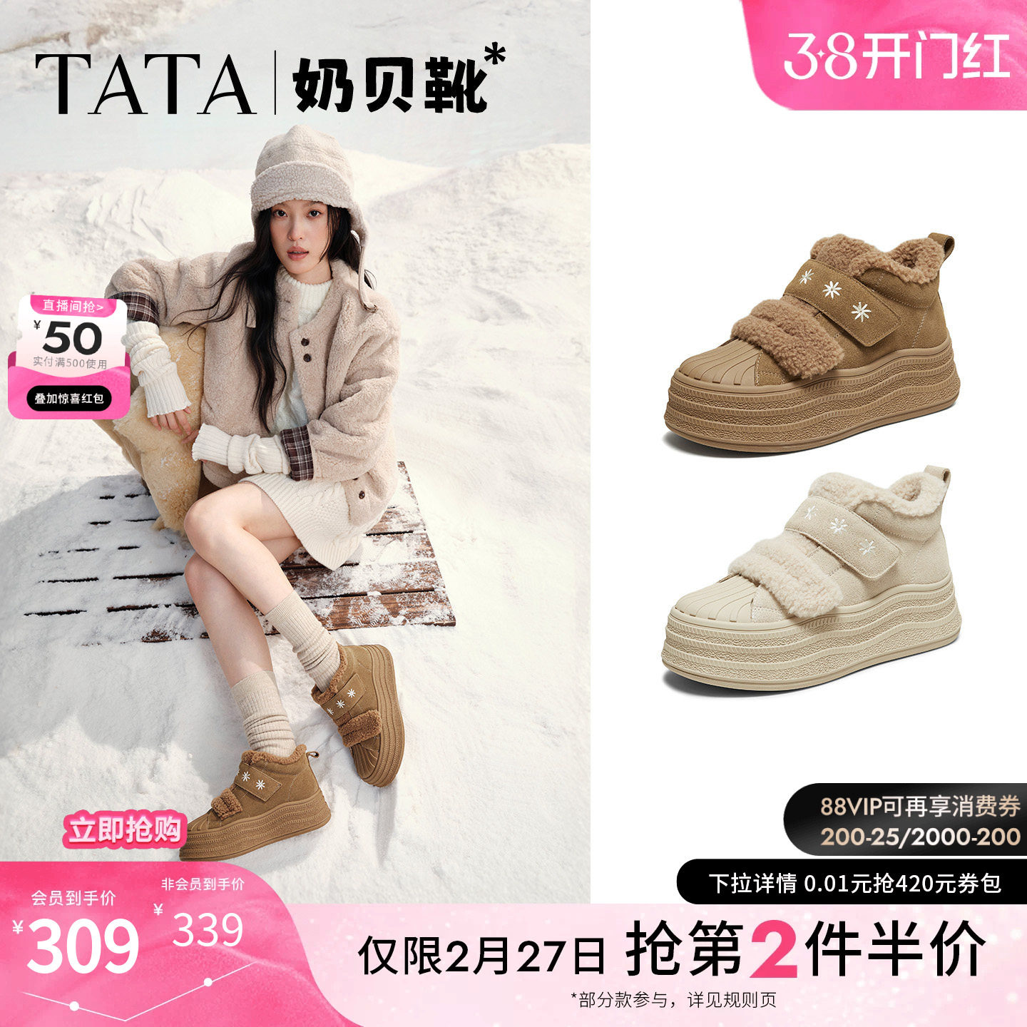 TATA他她奶贝靴女鞋冬高帮加绒厚底板鞋休闲雪地靴棉鞋子CT910DD5