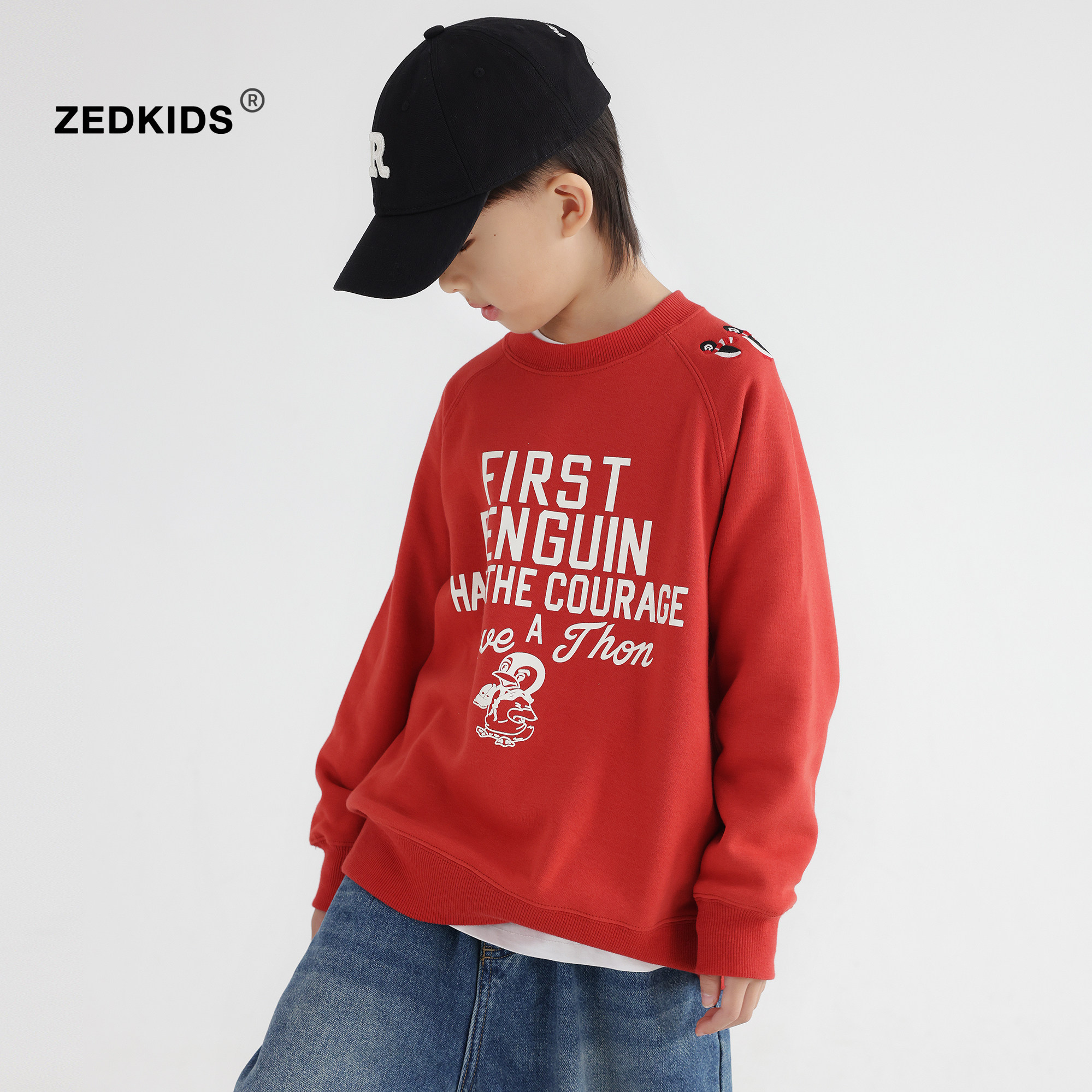张恩朵童装儿童加绒红色卫衣秋冬季男女童企鹅绣花不倒绒保暖上衣