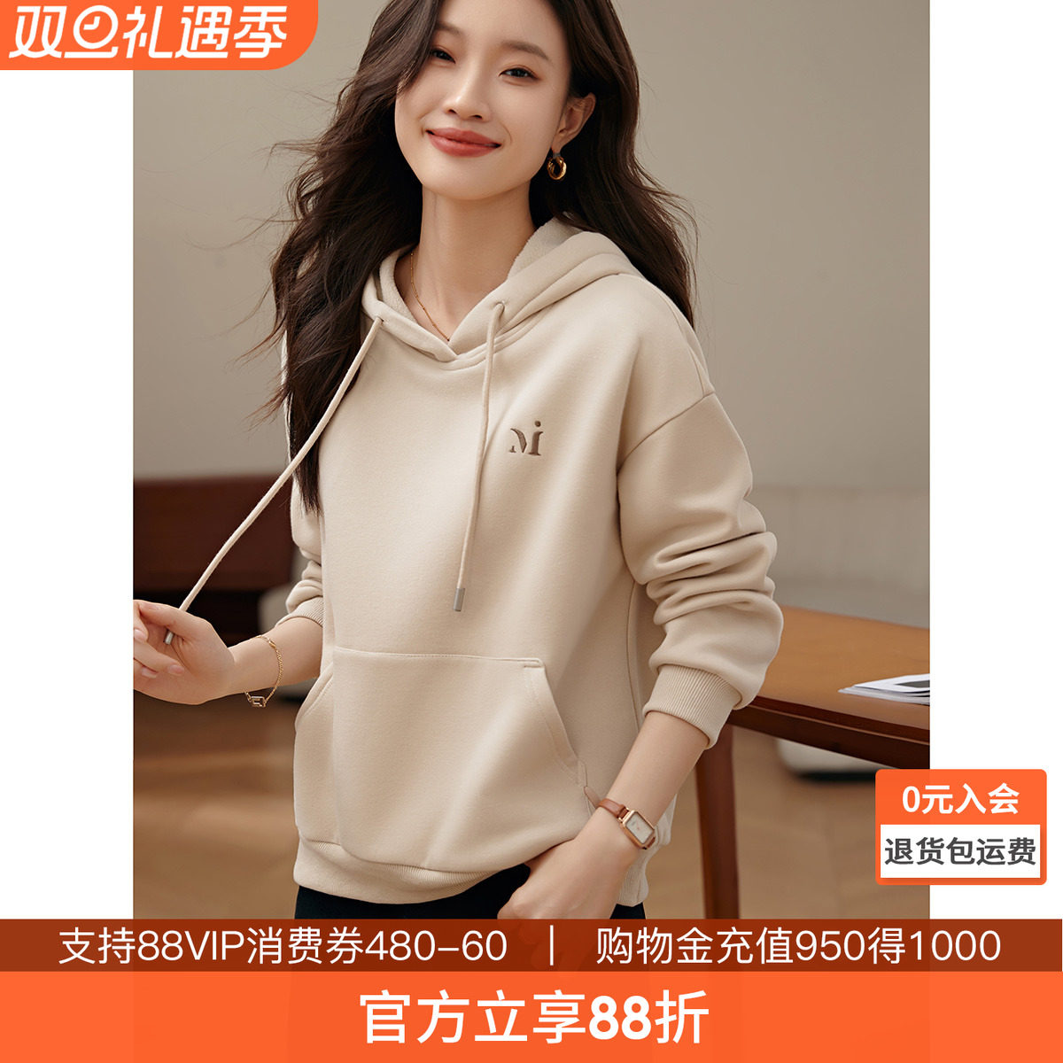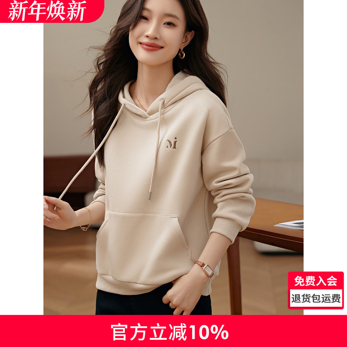 沫晗依美绣花加绒卫衣25春冬季新款女加绒加厚抽绳连帽百搭卫衣