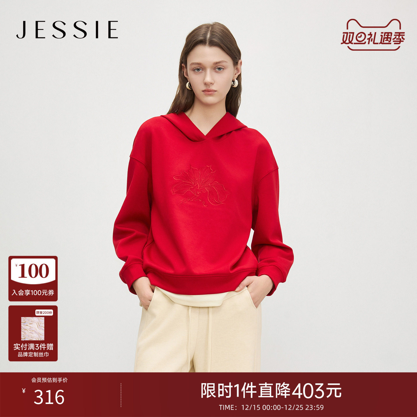 JESSIE25年秋季新款红色休闲长袖连帽卫衣女绣花假两件拼接落肩袖